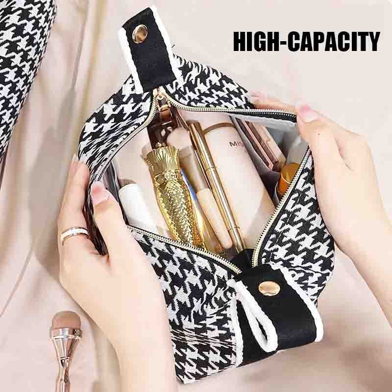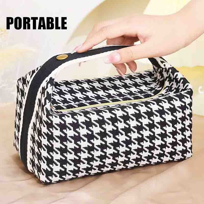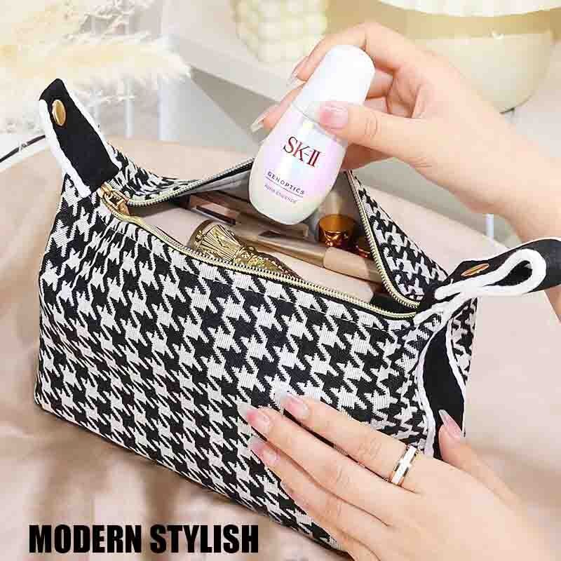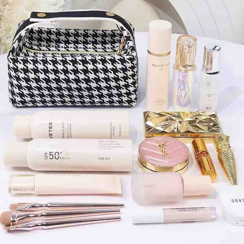 Introducing our exclusive Houndstooth Canvas Cosmetic Bag, a standout addition to our private label bags for cosmetics. This custom cosmetic bag offers a large opening design, full-body wrapped handheld, and a handle button design, making it both stylish and functional. With its portable and high-capacity design, this bag is an ideal choice for beauty enthusiasts on the go. What’s more, you can customize it with your logo with a low minimum order, making it perfect for custom cosmetic bags wholesale. Elevate your brand with our private label bags and offer your customers a premium, customizable option that combines practicality and style effortlessly.